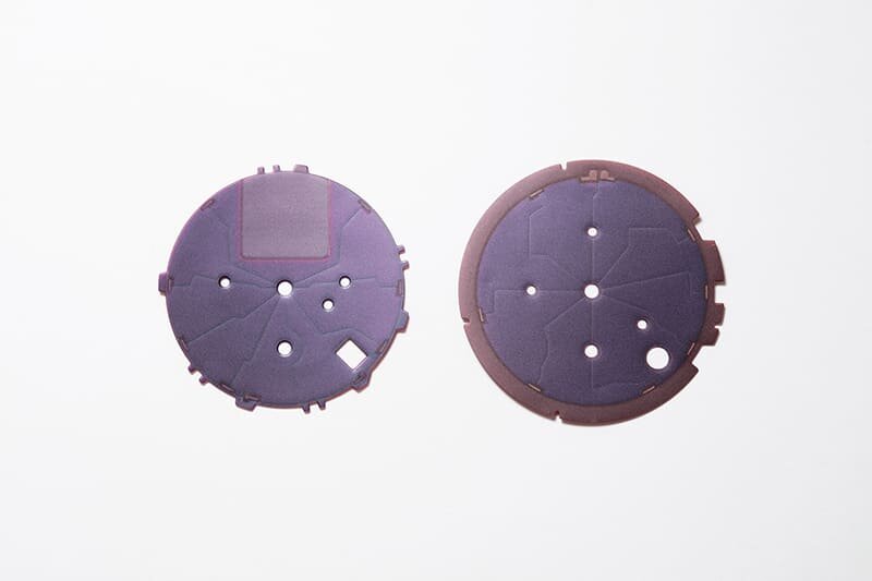 Az SSH159 számlap három rétege. A bal oldali, poliészter és akril kompozit anyagból készült reflektorlemez az alap, amelyre a számlaprész (középen) és a gyűrű alakú rész (jobbra) kerül elhelyezésre. A függőleges, csíkos struktúra mélyen benyomódik a számlap felületébe, amely áttetsző bevonatot kapott a hátlapon, így egy masszív, fémszerű textúrát kapunk.