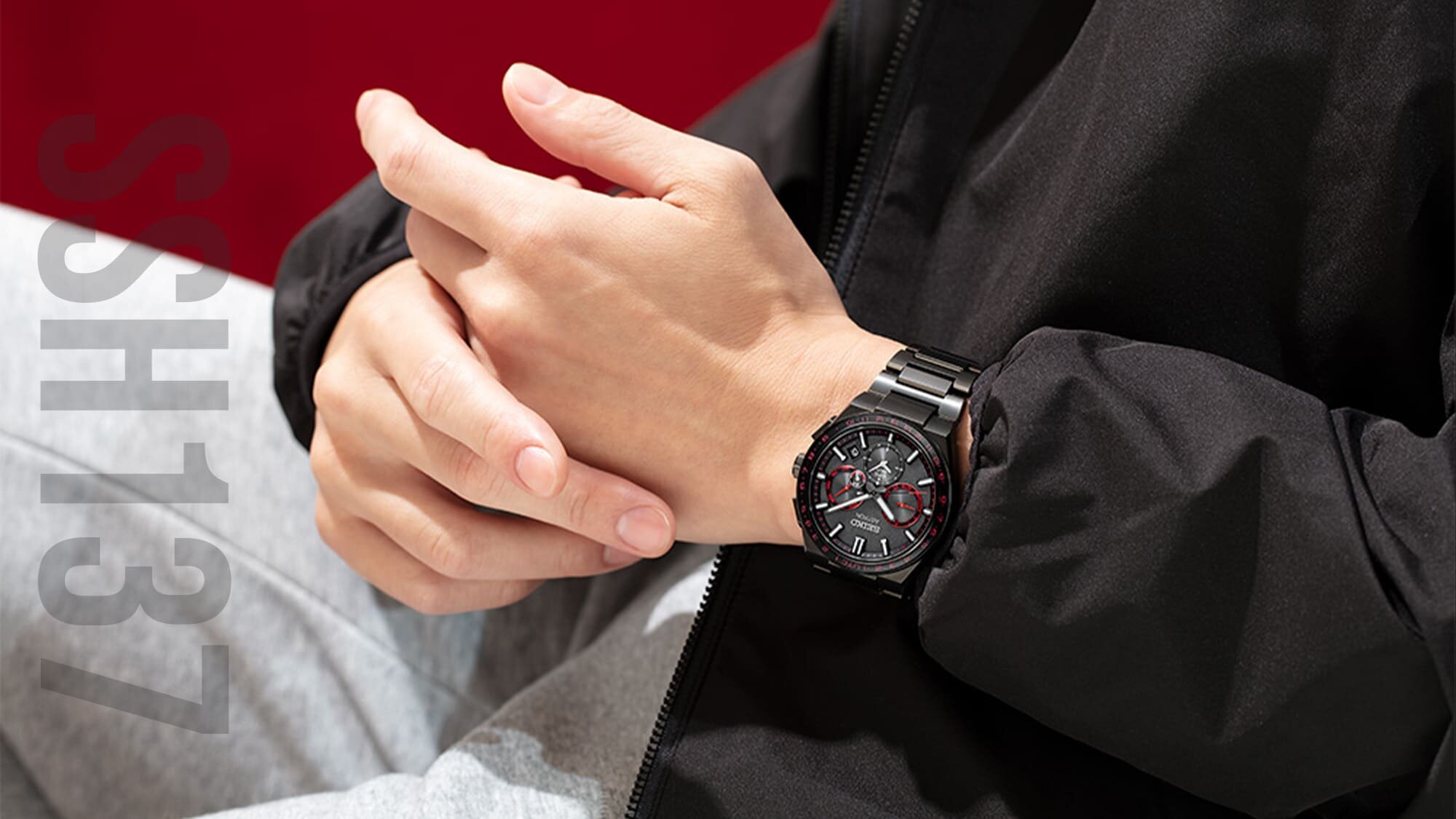 Az Astron SSH137J1 modell karakteres, határozott darab. A titán tok és fémszíj fekete bevonatot kapott, amely a vörös elemekkel erős designt alkot.