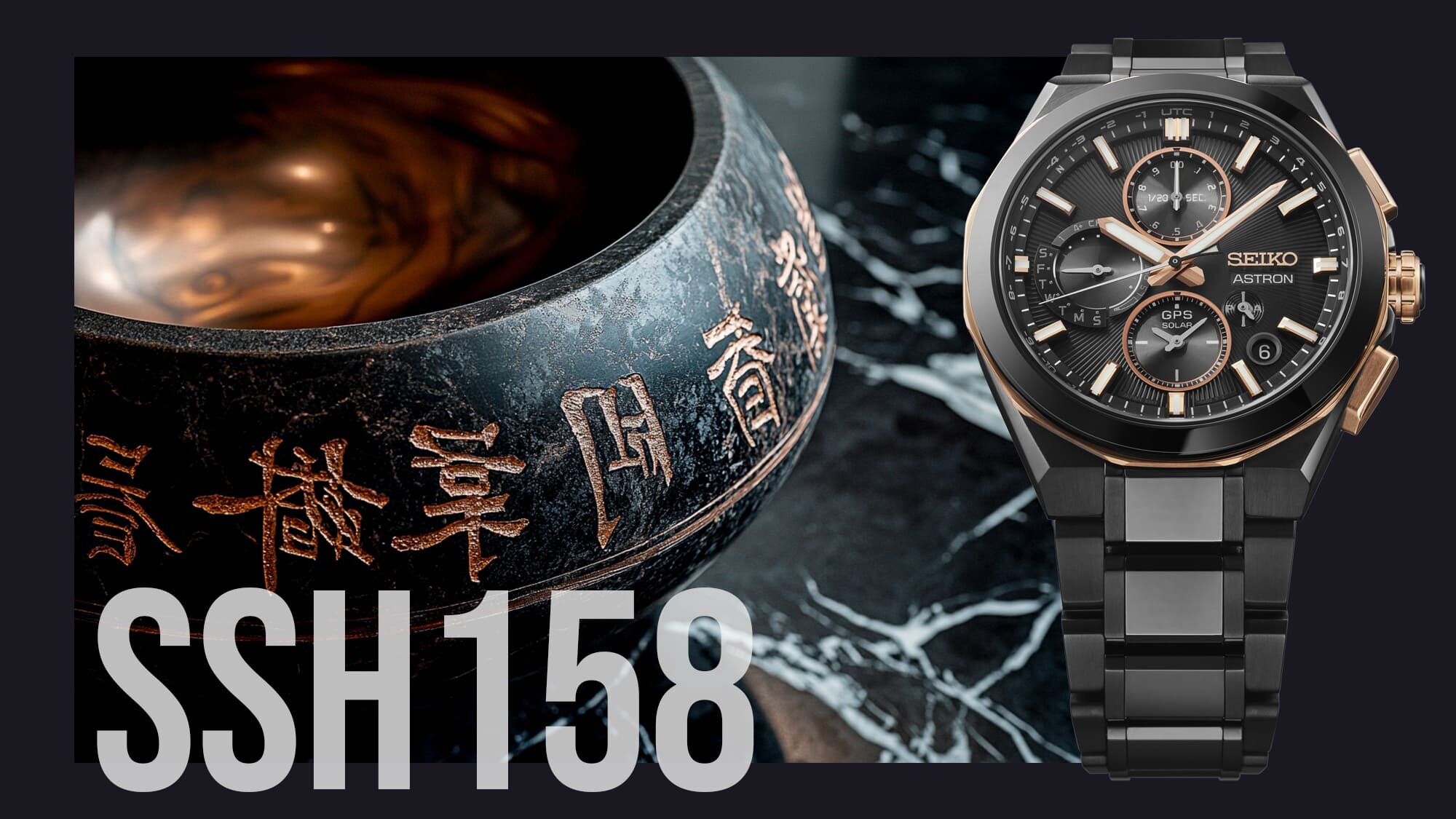 Az SSH158J1 is ilyen, a nagyobb, 43.4 mm átmérőjű titán tok és fémszíj (fémcsat) fekete bevonatot kapott, az egyedi kialakítású dupla lünetta, avagy ráma az üveg körül pedig fekete kerámiából és rosegold színű titánból készült - nemes anyagok és különleges kidolgozás teszik valóban limitált kiadássá ezt az órát.