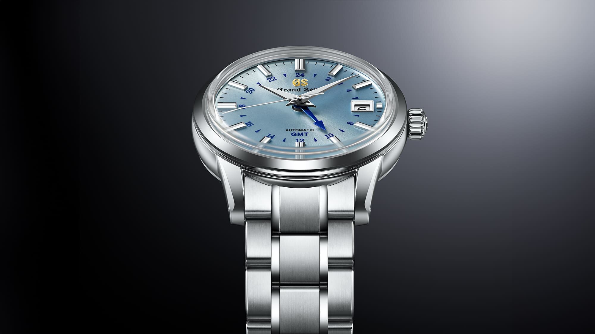 Ez az óra mindkét oldalán kínál különleges látnivalókat. Az elején a már említett égkék számlap, amelyen a jellegzetes, ezüstösen csillogó polírozott indexek a “sunray”, sugaras mintázatú számlapon az arany színű GS logóval és a kékített acél GMT mutatóval légiesen könnyed, fiatalos és egy nagyon kicsit elegáns hatást is keltenek egyszerre, így a fémszíjjal egy a mindennapokban jól viselhető órát adnak.