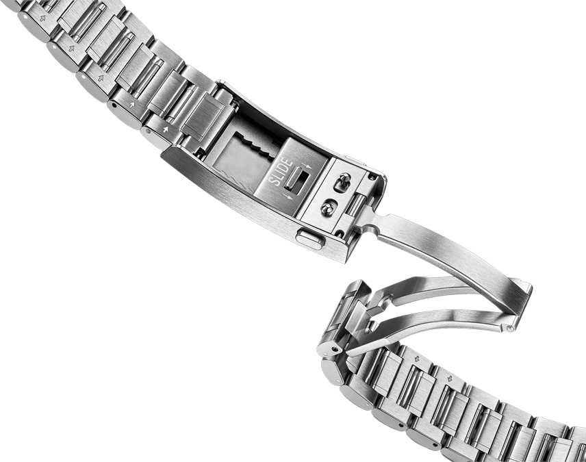 Ennek segítségével a csat két oldalán lévő gombokat benyomva egyszerűen, egy mozdulattal állíthatjuk a fémszíj hosszát 2 mm-es lépésekben, összesen 16 mm hosszban, így lefedve az egész napos változásokat kényelmesen, egyszerűen.