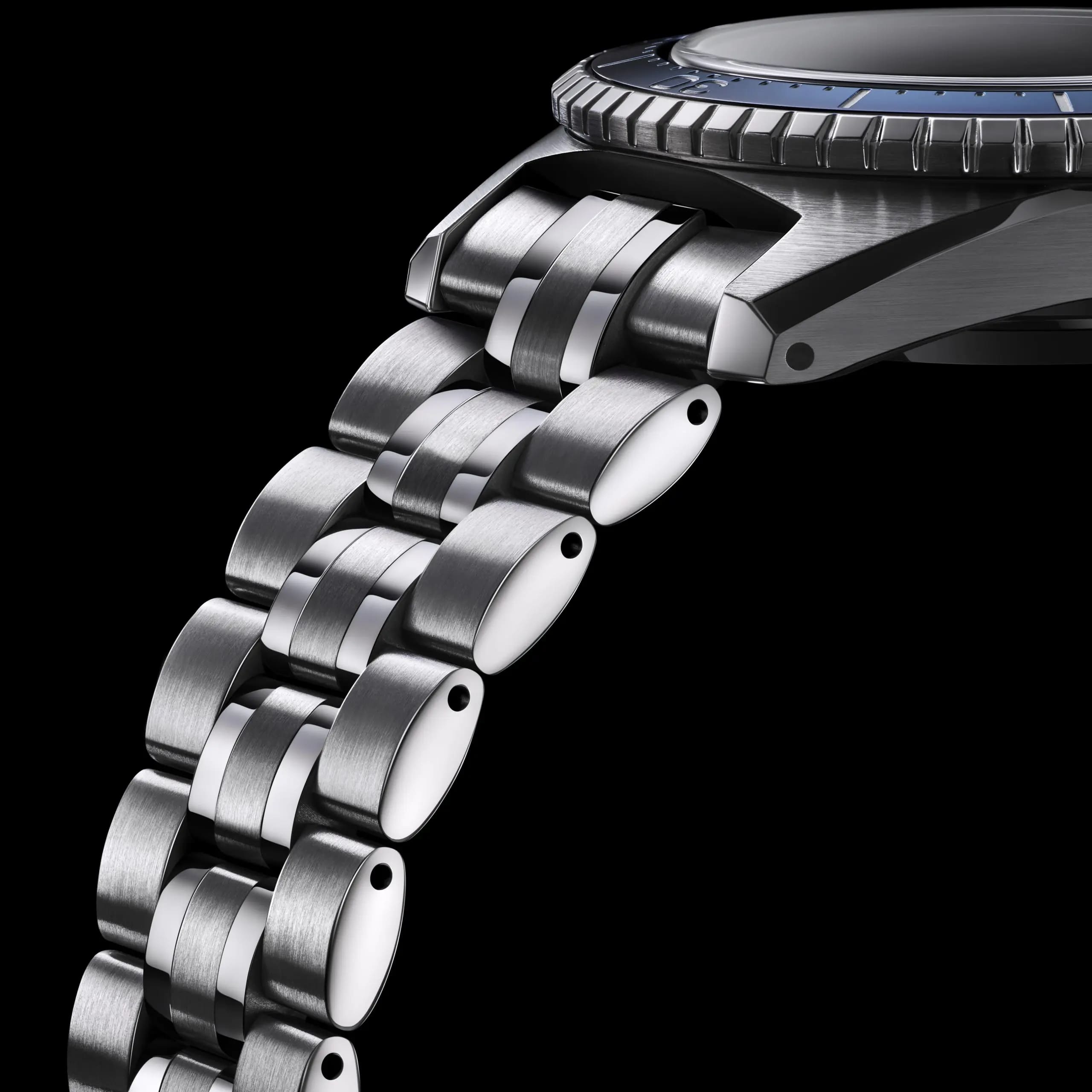 Fontos a megújult fémszíj (fémcsat) is, amely immár ötrészes kialakítású, és a középső szemek közül kettő polírozása eltér a többi szálcsiszolt felületétől, így az elegáns és prémium megjelenést erősíti ovális formájával is. A csat úgynevezett búvárhosszabbítós kivitel, amelynek segítségével egy mozdulattal meghosszabbítható és búvárruha ujjára csatolható.