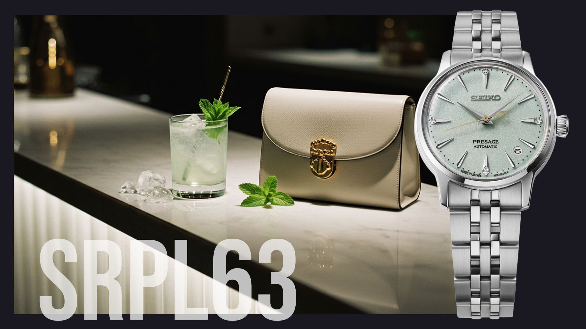 SRPL63J1, avagy a Frozen Mojito - egyike a legismertebb és legnépszerűbb koktéloknak. Kellemes zöldes árnyalatát a menta adja, a csillogó kövek és az arany másodpercmutató pedig visszafogott eleganciát adnak a megjelenésének.