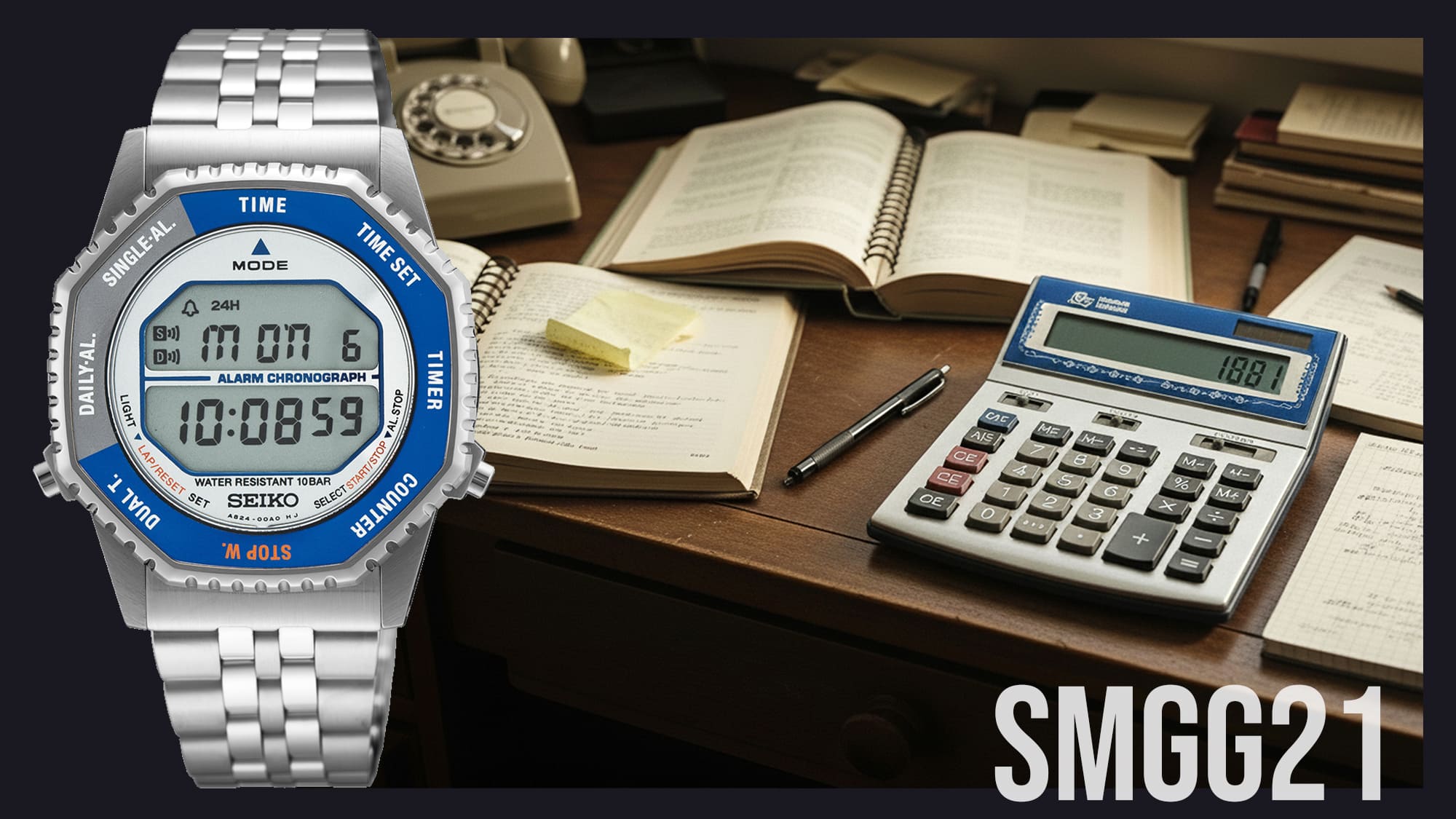 Az SMGG21P1 modellje szintén egy olyan színösszeállítást kapott, amely az eredeti órákon is megtalálható volt, a kék és ezüst igazi retró érzést ad, ez kapta a legkevesebb színt, mindössze a stopper funkció feliratai narancs színűek, minden más visszafogottan fehér vagy fekete.