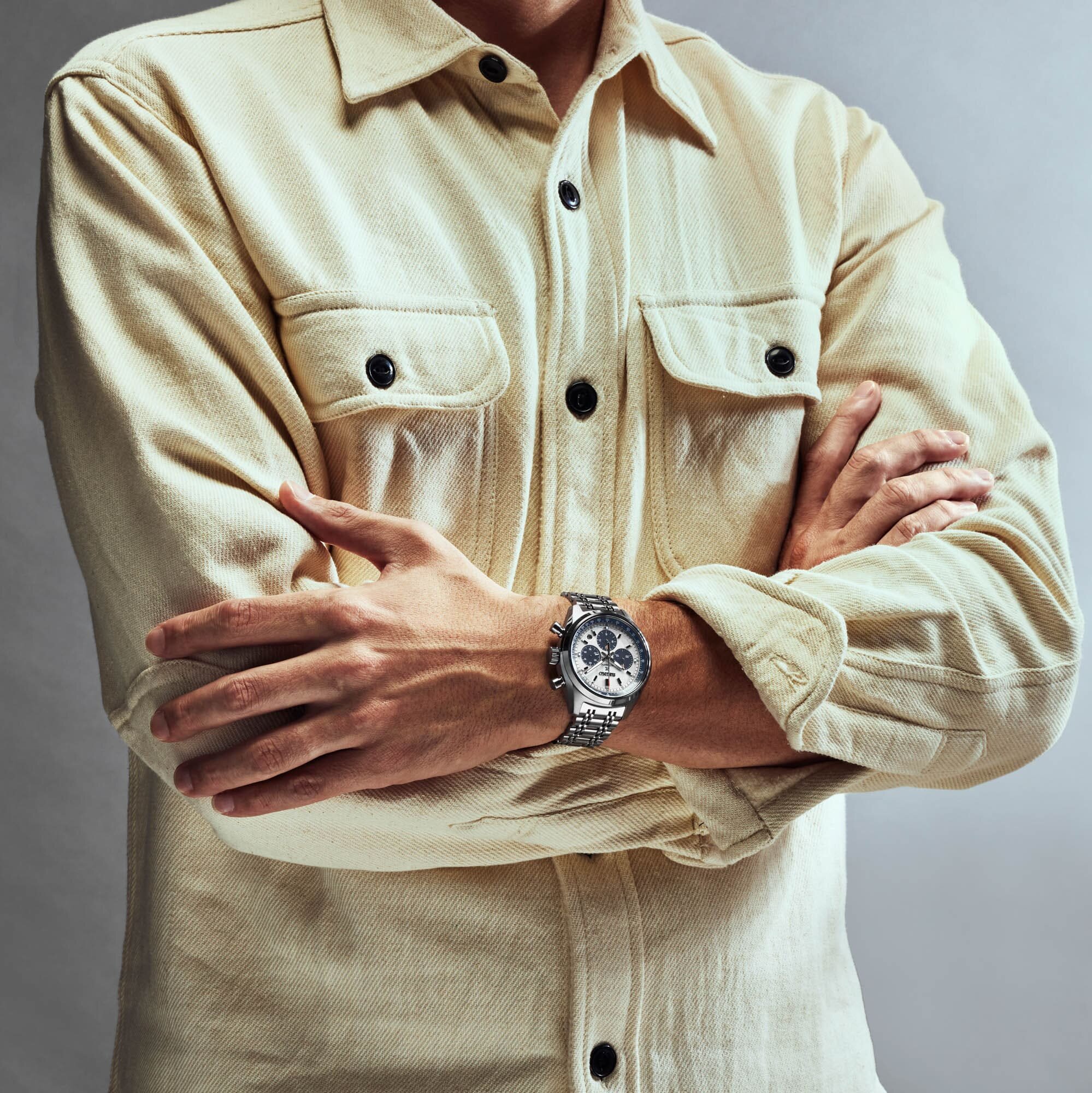 Megidézve a hetvenes évek stílusát, a tok kerek formája, a rövid tokfülek és a határozott lünetta egy új forma a mai Speedtimer sorozatban, amelyet jól kiegészít a napjainkban újra reneszánszát élő többrészes (itt éppen kilenc soros) fémszíj finom megoldása, évtizedeket repítve vissza minket az időben.