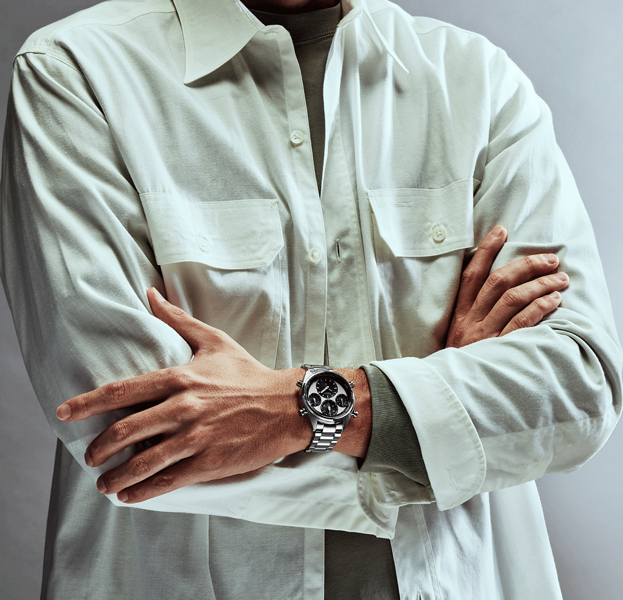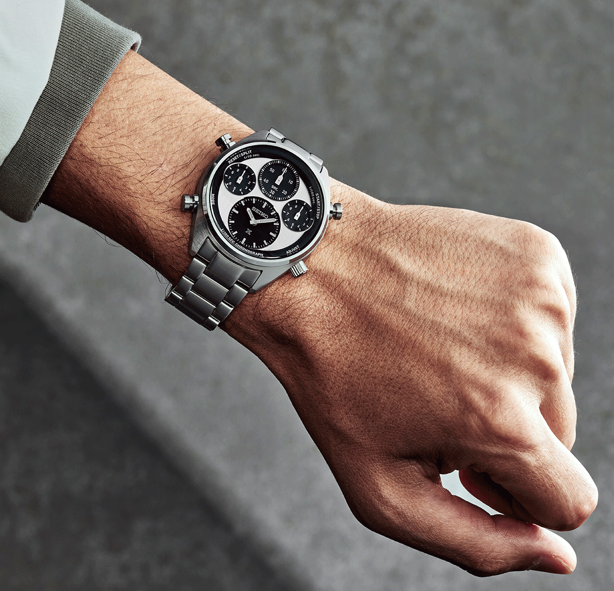 Az új Prospex Speedtimer SFJ001P1 modellhez egy új kaliber jelenik meg 8A50 névvel. A nevében minden benne van, amit tudni kell és tudni érdemes róla - 1/100 solar chronograph. Az 1/100 jelentése a századmásodperc pontosságú időmérés, amely analóg, mutatóval történő kijelzés esetén igen magas érték, összehasonlításképp egy átlagos kronográf ⅕ másodperces pontossággal mér, az 1/100-as érték ennek a hússzorosa - finomabban, precízebben, kifinomultabban. A solar kronográf egy kvarc kaliber, amely energiaellátását a fény biztosítja, ezt alakítja át elektromos energiává és tárolja a működtetéséhez akár hat hónapon át. A működéséhez szüksége solar panelek a számlapok alatt helyezkednek el, a mai technológia már annyira hatékony, hogy minimális fény is elég a töltöttség fenntartásához. A design bármennyire is modern, korábbi sikeres Seiko modellekből merít, a négy külön számlapra osztott “multi dial” megjelenés egy kultikus Seiko modell, a Kinetic Chronograph stílusa mai formába öntve. A négy számlapon külön-külön elhelyezett mutatók közül alul, hat óránál találjuk a legnagyobbat, ez a hagyományos időmérésé. A másik három számlap a sportidőmérésé, 12 óránál számolja a másodperceket, 10 óránál a tizedek és 2 óránál a századmásodperceket - rendkívül látványos, ahogy ez a századmásodperces mutató szinte repül körbe, amíg a stopper funkciót használjuk. Az SFJ001P1 fekete-fehér (vagy ahogy az órák világában nevezik, a Panda) színben érkezik