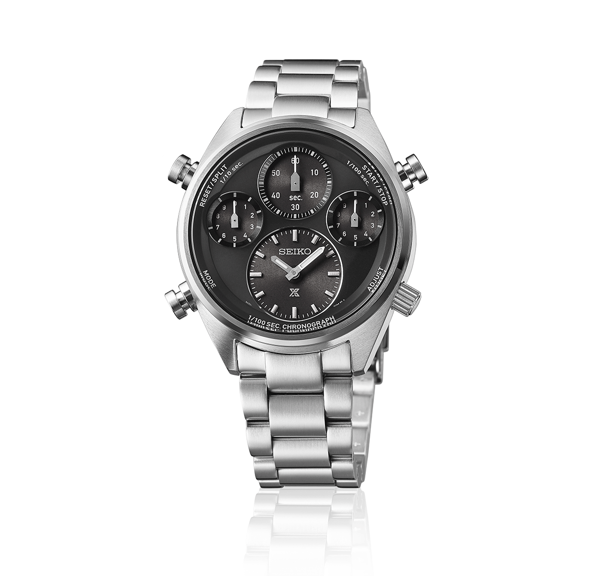Az új Prospex Speedtimer SFJ003P1 modellhez egy új kaliber jelenik meg 8A50 névvel.A nevében minden benne van, amit tudni kell és tudni érdemes róla - 1/100 solar chronograph Az 1/100 jelentése a századmásodperc pontosságú időmérés, amely analóg, mutatóval történő kijelzés esetén igen magas érték, összehasonlításképp egy átlagos kronográf ⅕ másodperces pontossággal mér, az 1/100-as érték ennek a hússzorosa - finomabban, precízebben, kifinomultabban. A solar kronográf egy kvarc kaliber, amely energiaellátását a fény biztosítja, ezt alakítja át elektromos energiává és tárolja a működtetéséhez akár hat hónapon át. A működéséhez szüksége solar panelek a számlapok alatt helyezkednek el, a mai technológia már annyira hatékony, hogy minimális fény is elég a töltöttség fenntartásához. A design bármennyire is modern, korábbi sikeres Seiko modellekből merít, a négy külön számlapra osztott “multi dial” megjelenés egy kultikus Seiko modell, a Kinetic Chronograph stílusa mai formába öntve. A négy számlapon külön-külön elhelyezett mutatók közül alul, hat óránál találjuk a legnagyobbat, ez a hagyományos időmérésé. A másik három számlap a sportidőmérésé, 12 óránál számolja a másodperceket, 10 óránál a tizedek és 2 óránál a századmásodperceket - rendkívül látványos, ahogy ez a századmásodperces mutató szinte repül körbe, amíg a stopper funkciót használjuk.