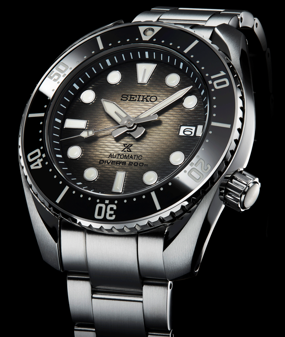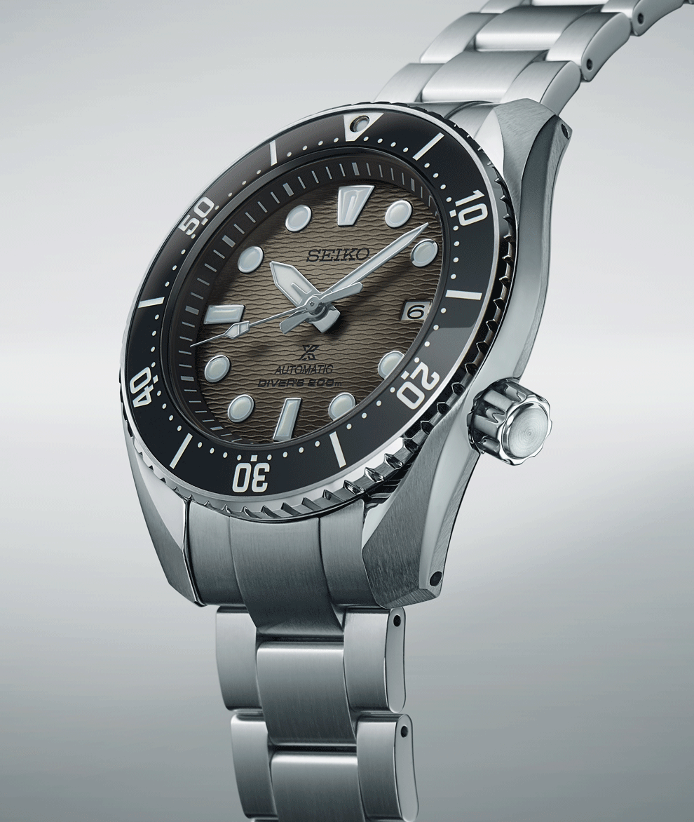 A Seiko Sumo SPB323J1 modellnél kisebb változásokat fedezhetünk fel. Az egyedi tokforma megmaradt, a lünetta szinte belesüllyed a tokba, ez sokat segít abban, hogy az elsőre nagynak hangzó 45 mm-es tok átmérő ellenére is egy kényelmesen viselhető darab legyen. A zafír kristály óraüveg ebben a kategóriában persze már alap, és emellett kerámia lünettát kapott – a kissé frissített betűtípusok így már a kerámia jellegzetes fényével büszkélkedhetnek, ez a nemes anyag a felső kategóriás búvárórák sajátja. A Seiko saját “Super hard Coating” felületkezelésével ellátott nemesacél tokot és fémszíjat kapott, amely hosszabban őrzi meg a tokot és a fémszíjat az eredeti, karcmentes szépségében. Az SPB323J1 modell számlapja az új, hullámzó tengert idéző számlappal készült, ám a színe most nem a tengert, hanem annak partját idézi. A „vignettált” számlap a tengerpartok homokpadjainak jellegzetes barnás színárnyalatait hozta el, ritka, mégis nagyon kellemes színösszeállításban.