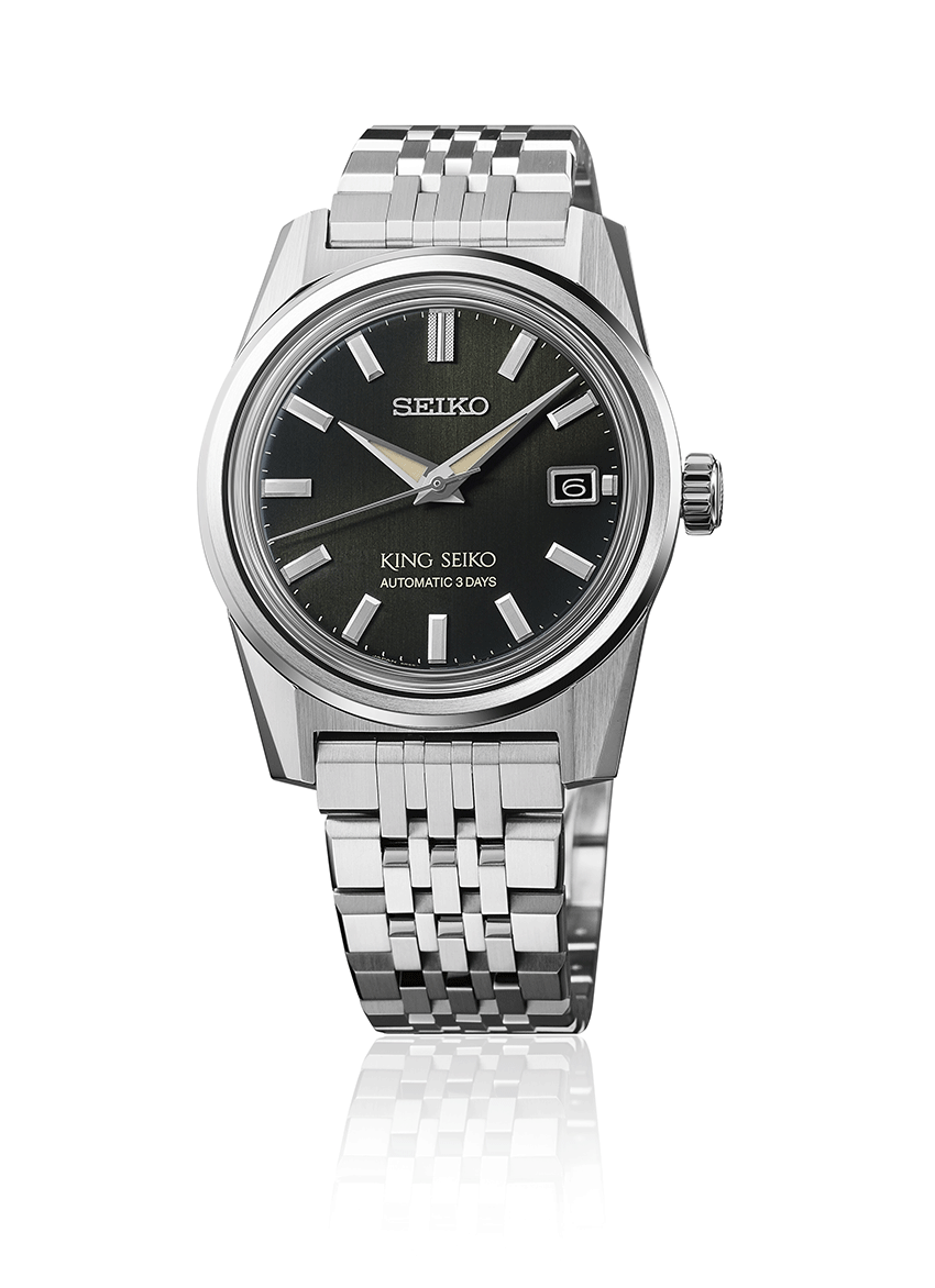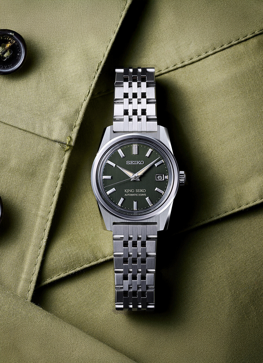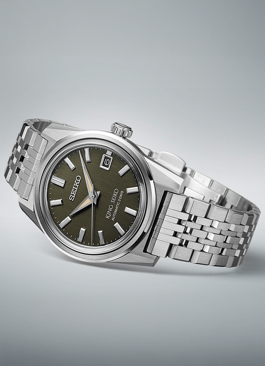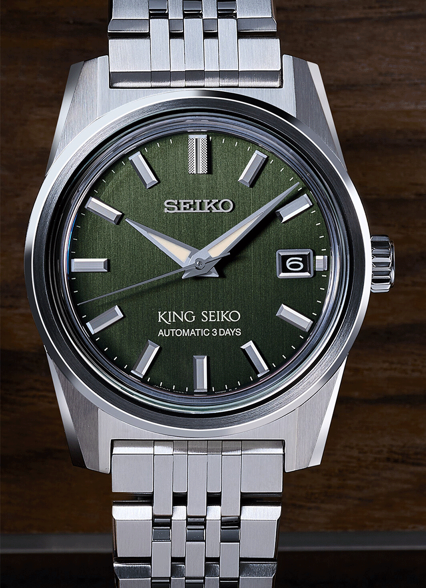Az új King Seiko sorozat megjelenése tökéletesen hozza vissza a hatvanas-hetvenes évek érzéseit, ebben segít a 44KS stílusába készülő tok formája éppúgy, mint a fémszíj kialakítása. A nemesacél tok és szíj szálhúzott felülete is a vintage hangulatot erősíti. A King Az SPB373J1 számlapjának zöld színe egyszerre érdekes és egy kicsit más, mint a megszokott számlap színek, mégis mára teljesen elfogadott a zöld minden árnyalata s számlapoknál. Az SPB371J1 mérete, melynek tokátmérője 39 mm lehetővé tette egy plusz komplikáció megjelenítését is a számlapon, így mostantól dátumablakot is találunk a King Seiko-n. Ehhez természetesen szükség volt egy új kaliberre is. 6R55 szerkezet érdekessége a dátum komplikációja mellett a megnövelt, 72 órás járástartalék, amely a számlapon is feltüntetésre került egy kis játékkal - a 72 óra helyett a stílusosabb “3 Days”, vagyis “3 nap” felirat található.