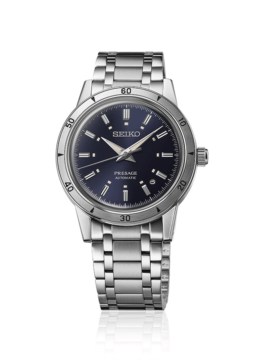 A Presage Style 60’s sorozata azokat a hatvanas éveket idézi fel, amelyekre sokan oly szívesen gondolunk, ha az óraipar és a Seiko történelméről esik szó. Az SRPL07J1 modell, tengerkék számlapjával jól hozza a sorozatban megismert hangulatot. Úgy lett modernebb, hogy közben mit sem változott a megjelenése, csak a részletek finomodtak, és néhány adat változott. Kisebb lett a tok, a korábbi modellek 40.8 mm-es mérete helyett immár 39.5 mm az átmérője, ez jól illeszkedik az óraiparban évek óta látható óvatos “downsizing” sorba, a korábbi folyamatos méret növekedés helyett most újra fordult a trend, ezúttal a csökkenést látjuk. A számlapon felfedezhetünk egy érdekességet, az eddigi, 3 óránál elhelyezett és fém kerettel ellátott dátumablak helyett a komplikáció 4 és 5 óra közé költözött, a szerkezet azonban változatlanul a jól ismert 4R35 mechanikus automata kaliber.