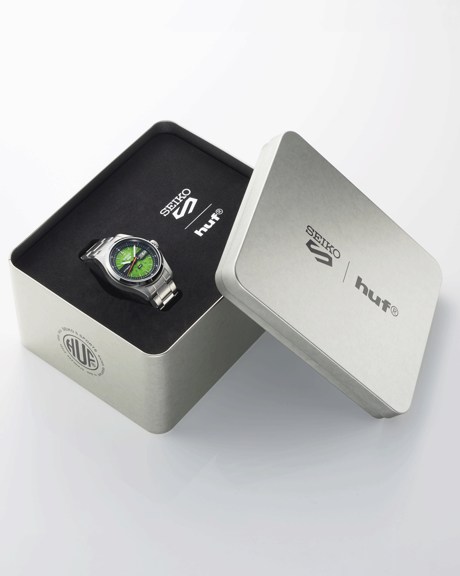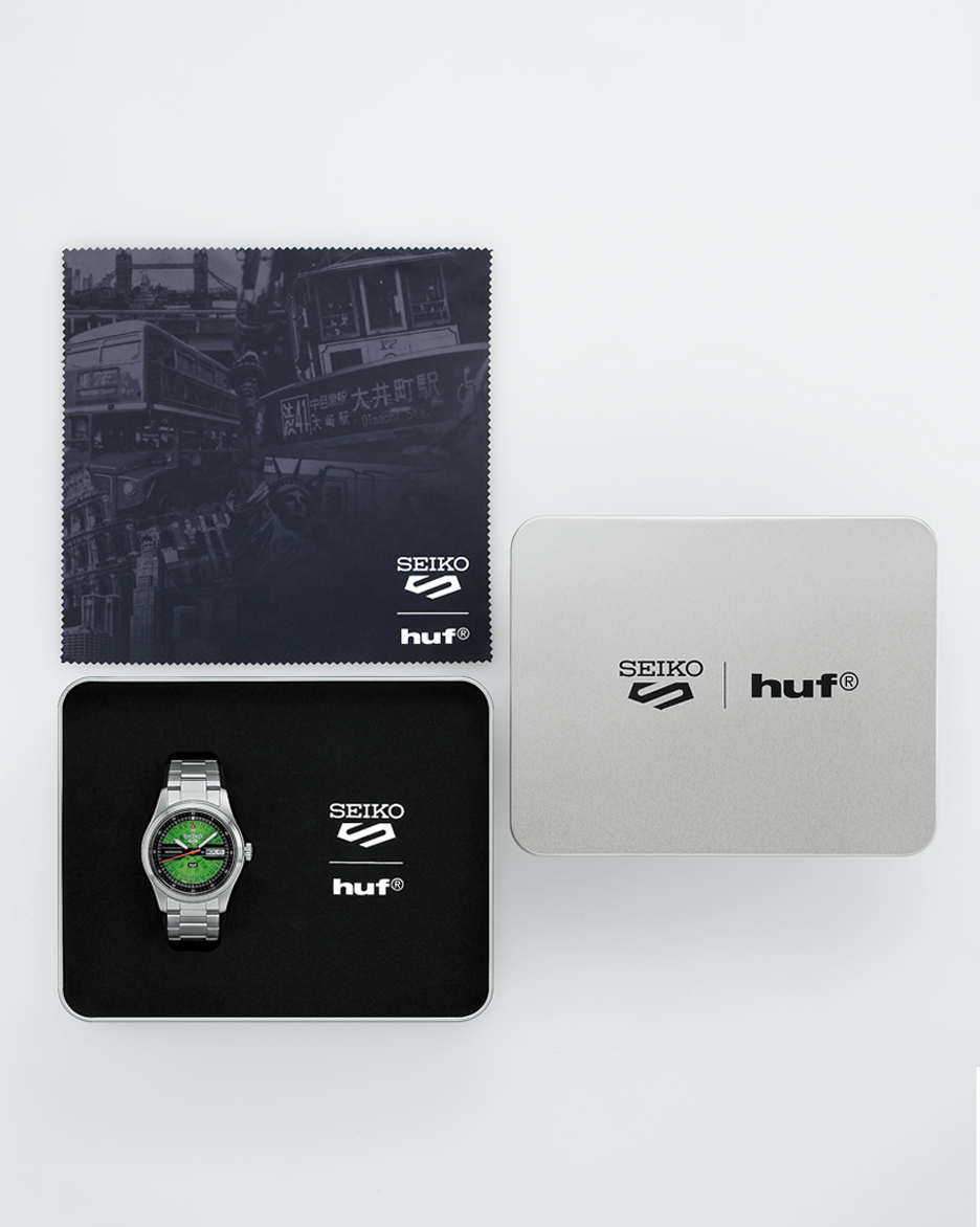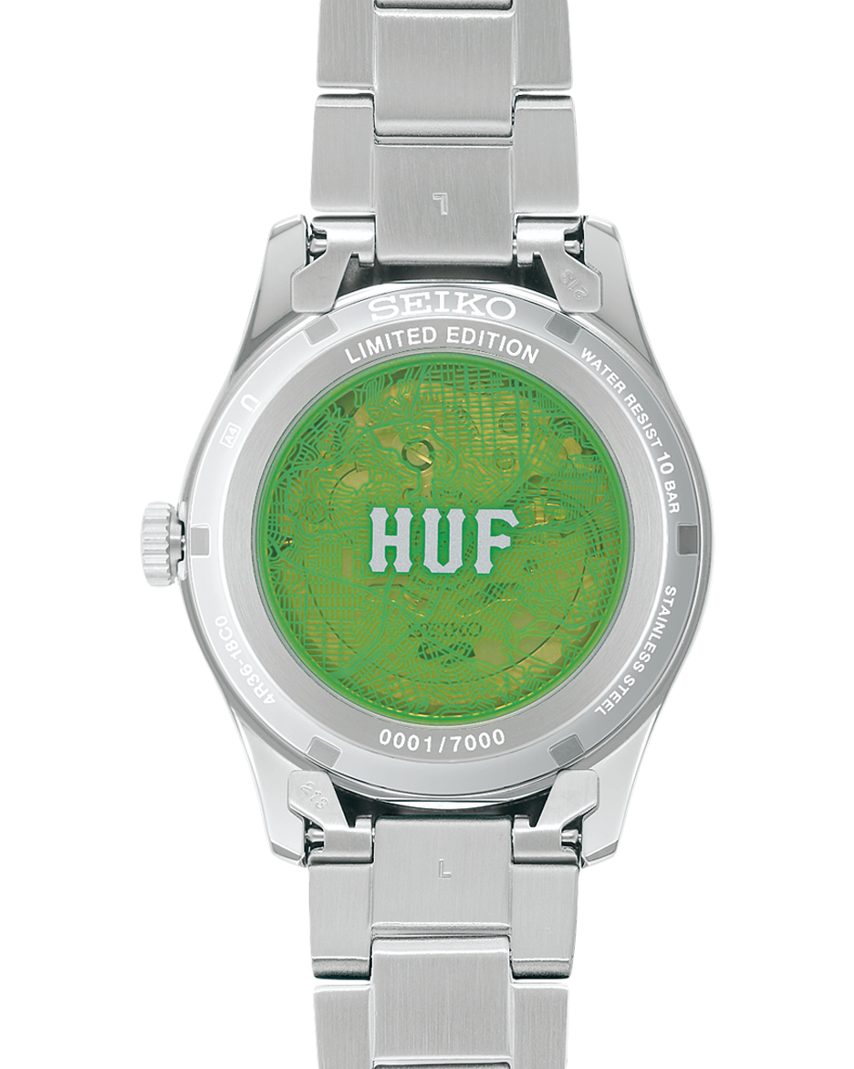 A Seiko 5 Sports SRPM09K1 egy különleges, HUF együttműködésben készült, 7000 darabra limitált kiadás, amely a hetvenes évek egyik jellegzetes Seiko modelljének hangulatát idézi meg modern, streetwear ihletésű köntösben. A modell karakterét a félig áttetsző, HUF Green árnyalatú számlap adja, amely játékosan enged betekintést a szerkezet világába, miközben a 6 óránál elhelyezett „huf” logó teszi igazán egyedivé az összképet.A kompakt, 39,4 mm-es nemesacél tok kényelmes viseletet biztosít a mindennapokban. Az órában a megbízható Seiko 4R36 automata szerkezet dolgozik, amely kézi felhúzási lehetőséggel és körülbelül 41 órás járástartalékkal rendelkezik. A nap- és dátumkijelzés praktikus kiegészítője a mindennapi használatnak, míg a LumiBrite bevonattal ellátott mutatók és indexek sötétben is jól leolvashatóvá teszik az időt. A hátlap üvegbetétes, HUF Green színnel és San Francisco ihlette grafikával díszített, emellett LIMITED EDITION felirat és egyedi sorszám gravírozás jelzi az exkluzivitását. A különkiadás speciális dobozban érkezik, és egy egyedi óratörlő kendő is jár hozzá.